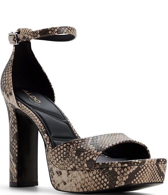 From ALDO, the Eleonia Snake Embossed Ankle Strap Platform Block Heel Sandals feature:
