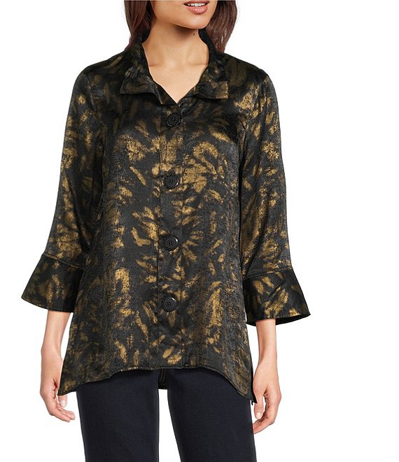 Ali MilesShimmer Woven Allover Multi Print Wire Collar 3/4 Bell Sleeve Button Front Tunic