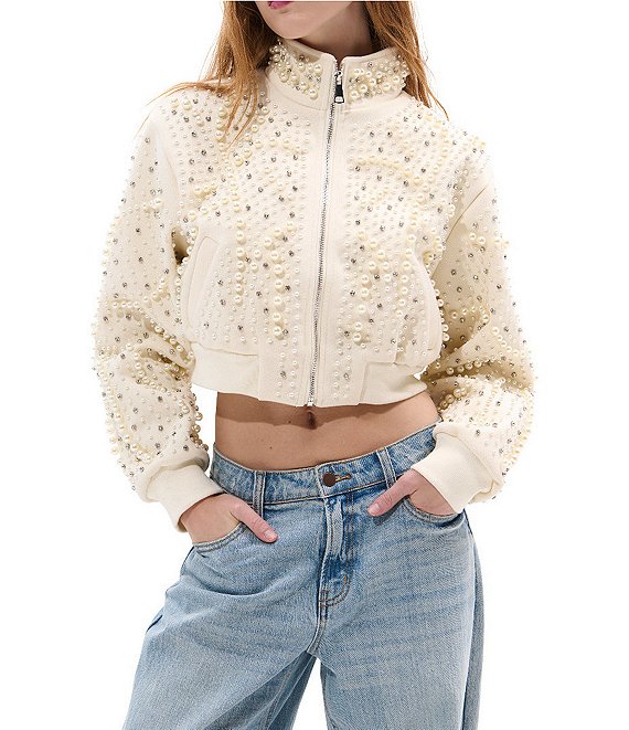 Azalea WangEthel Solid Pearl Accent Stand Collar Zip Front Cropped Jacket