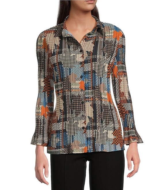 CalessaPetite Size Patchwork Check Print Woven Point Collar Long Sleeve Button-Front Flute Pleated Tunic