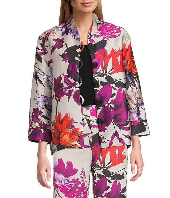 Caroline RoseCoordinating Floral Print Mikado Mandarin Collar Cuffed 3/4 Sleeve Button Front Statement Jacket