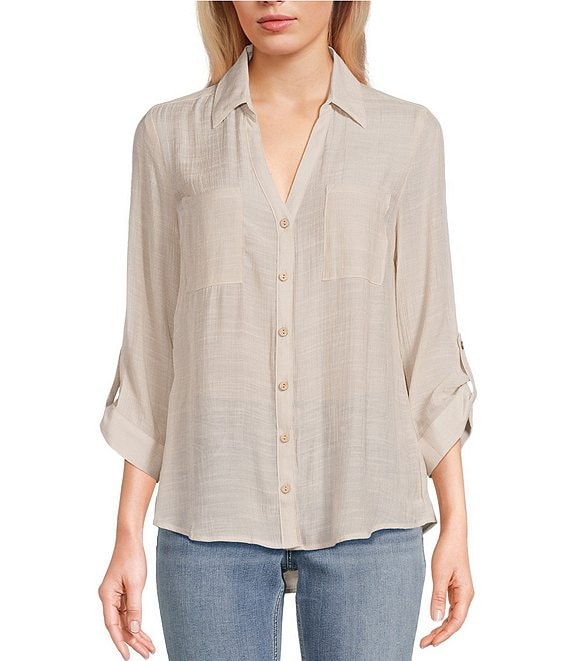 I.N. San FranciscoTextured Woven 3/4 Roll Tab Sleeve Patch Pocket Button Front Shirt