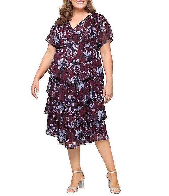 Ignite EveningsPlus Size Floral Print Chiffon Tea Length Flutter Sleeve Tiered Dress