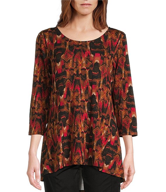 IntroKnit Jersey Abstract Geo Print 3/4 Sleeve Pleated Neck Tee