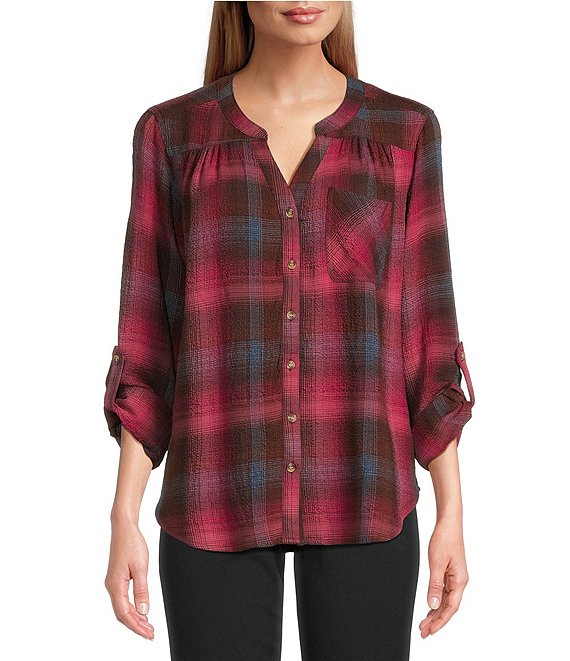IntroPetite Size Woven Red Bud Band Plaid V-Neck Long Roll-Tab Sleeve Button Front Blouse