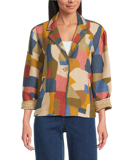 John MarkAbstract Geo Print Notch Collar Long Roll Sleeve Blanket Stitch Button Front Jacket
