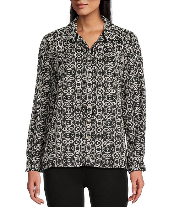 John MarkAll Over Embroidered Triangular Geo Print Point Collar Long Roll Tab Sleeve Button Front Shirt