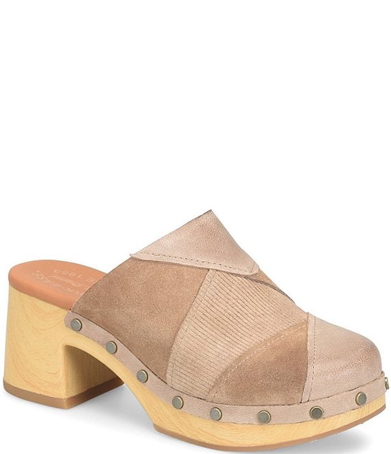 From Kork-Ease, the Tay Suede and Leather Studded Patchwork Block Heel Clogs feature: