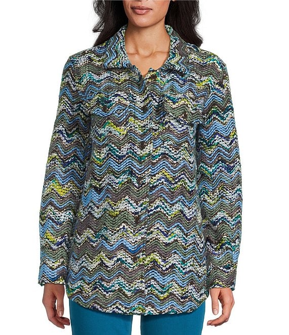 MultiplesChevron Embroidered Point Collar Long Cuffed Sleeve Button Front Shacket