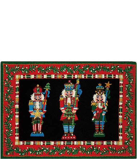 - Add a festive touch to your home décor with this exquisite 100% wool rug. This 2'x3' hand-hooked rug features a striking design of three nutcrackers standing proudly on a rich black background. Holiday garland set against a festive red ground creates a vibrant contrasting border.