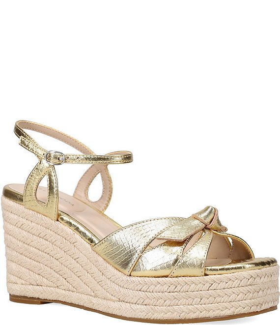 From Pelle Moda, the Elbie Snake Embossed Metallic Leather Bow Platform Espadrille Wedge Sandals feature: