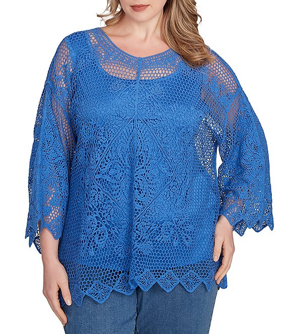 Ruby Rd.Plus Size Crochet Medallion Floral Pattern Scoop Neck 3/4 Wide Flared Sleeve Top