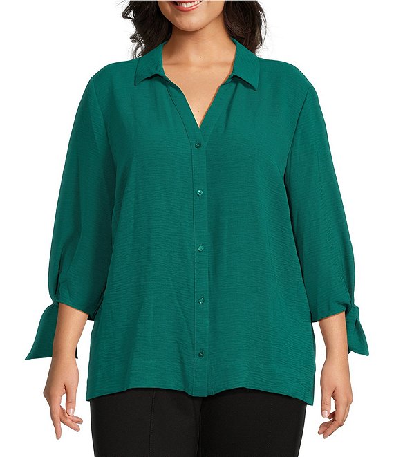 InvestmentsSlim Factor by Investments Plus Size Nicole Point Collar Y-Neck 3/4 Tie Sleeve Button Front Top